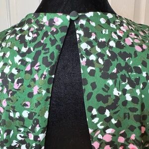 This stunning Topshop dress is perfect for any party or wedding occasion. The contemporary pattern in black, pink, and green is eye-catching and girly, making it a great choice for a night out or a special event. The dress features short flutter sleeves, a round neckline, and a cutout back that adds a touch of boho chic to the overall look.