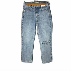 - One distressed knee - Straight leg - Cropped length - Button fly - 100% cotton - Size US 4 Measurements: waist laying flat approx 13in, inseam approx 24in. Bought when I was size 25/26