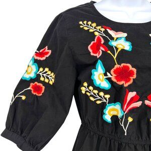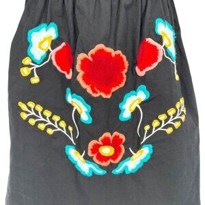 This black mini dress features vibrant floral embroidery and a stylish open tie back. The lightweight cotton material ensures comfort and breathability.