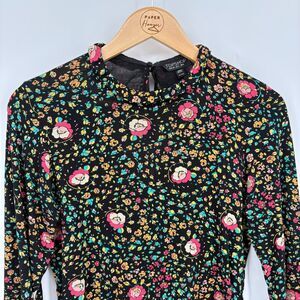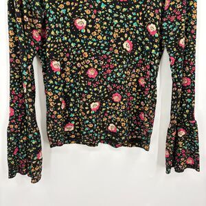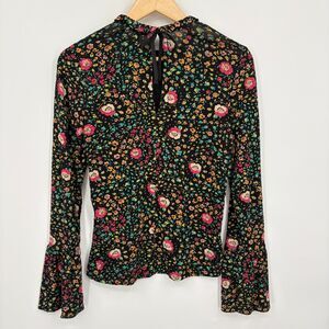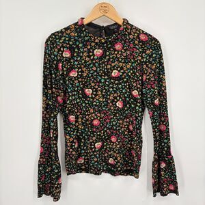 Topshop Floral Bell Sleeve Stretch Knit Boho Top Sz 2, Tie Back Hippie Whimsical