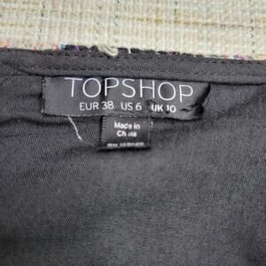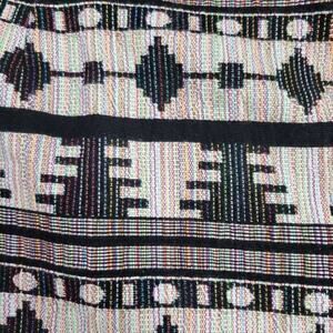Topshop Fringe Aztec Print Pelmet Skirt Size 6. Multi colored Aztec skirt with fringe hem detailing. Three tiers of tassel fringe towards bottom of skirt. Rear zipper. Lined. Outer: 72% Cotton, 28% Viscose. Size US 6. Excellent Used Condition.
