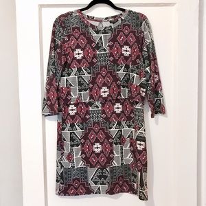 A lovely geo print styles a three-quarter sleeve dress featuring a cropped overlay bodice with a fluttery open back and a leg-flaunting skirt. Muted/faded burgundy-purple color scheme. Like New Condition. Size 8, M.