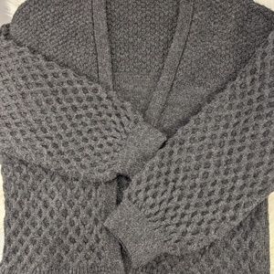 Cozy gray cardigan. Textured knit design. Open front style. Perfect for layering.