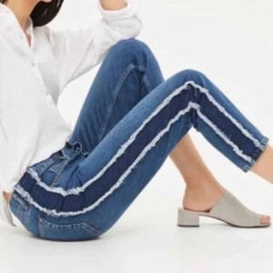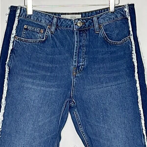 Topshop Hayden Side Panel Boyfriend Jeans - See Measurements. Good pre-owned condition. Not sure if these were altered or mismarked at the factory. I've checked the hems for signs of altering and can't find any reason to believe they were altered. Marked a 30" inseam yet they measure 25". No way they could shrink that much, even being 100% cotton. There is a white mark on the front of the left leg. It's just where the dye didn't catch in manufacturing. They are a boyfriend fit, button fly, 100% cotton, 5 pockets, side panel inserts with fringing, cropped length. Approximate measurements: 17" waist, 11" rise, 25" inseam.