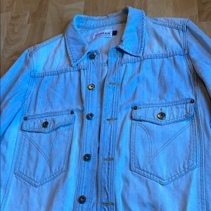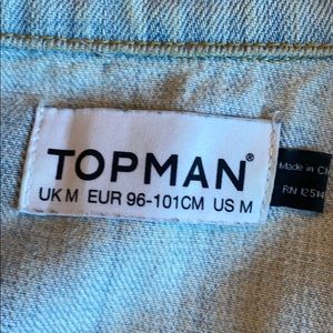 Light wash Topshop/Topman denim jacket. This jacket was purchased second hand & worn very little. Very good condition - pretty soft & very comfortable denim. Minor distressing on the collar & sleeves, although I think this is intentional. The first button on the right sleeve is missing, so I replaced it with a safety pin 🧷 while I wore it. Colour best illustrated in last pic. Perfect for any outfit - truly a catch all piece. 💙👖