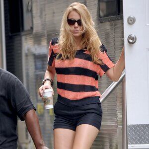 Topshop Knitted Striped Top in Black and Peach as seen on Blake Lively on the set of Gossip Girl in August 2009. She also wore the same top in cream on another occasion. Nothing screams "staple wardrobe piece" like wearing the same thing in different colors. Both are incredibly hard to find now since they were bought up years ago.