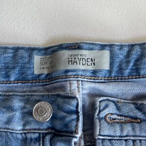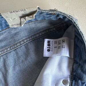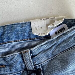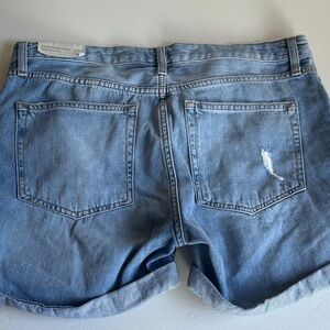 Stylish light blue denim shorts. Features distressed details and rolled cuffs. Button fly closure.