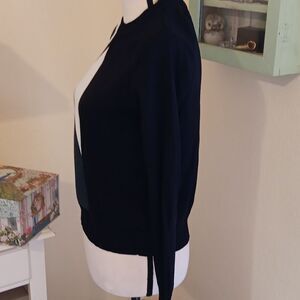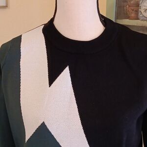 Evergreen (looks like gray in my photos) white and black. This is a very cool sweater. A golf influence? Just THIS lightning bolt on the course , please! Sharp thunderbolt on front. Size 2 measures 40 at chest, 34-40 at ribbed bottom hem. 21 long from shoulder to hem. Sleeves 23. The best sweater!