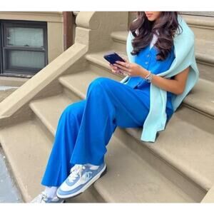 These Topshop Mensy pants feature a high-rise, pleated front, and a relaxed, wide-leg fit in a rich blue color. Perfect for a laid-back, stylish look, they pair well with casual tops.
