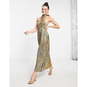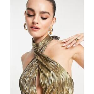 Topshop Metallic Plisse Dress Cut Out Halter Neck Evening Party Gold NWT 12