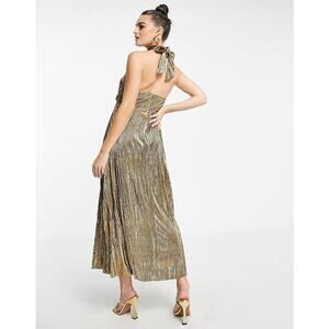 Topshop Dress Plisse Cut Out Halter Neck Metallic Evening Party Midi Gold NWT 12