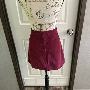 Stylish burgundy mini skirt featuring a front zipper and pockets. Perfect for casual outings.