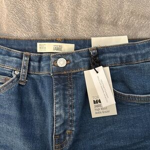 • Style: High-waisted Moto Jamie jeans with distressed detailing on the knees and thighs