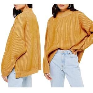 Cozy and stylish Topshop ribbed pullover sweater in mustard yellow with contrast white striping. Features a mock neckline, drop shoulders, and an oversized slouchy fit with side slits for easy layering. Crafted in a medium-weight knit, perfect for year-round wear.