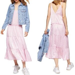 Topshop Brand New With Tags Floral Tiered Satin Prarie Cottagecore Spaghetti Strap Lagenlook Spring Summer Drop Waist Slip Botanical, Unique, Whimsical Prarie Dress Size 8, Appropriate for Outdoor Party Gathering Baby Shower, Bridal Shower, Family Gathering, Shopping, Beach, Poolside,Vacation Wear, Fun Casual Comfort Cool Summer Dress