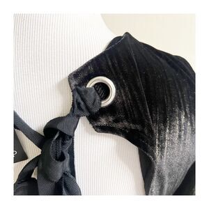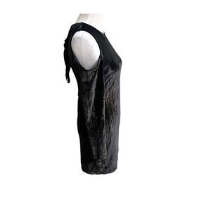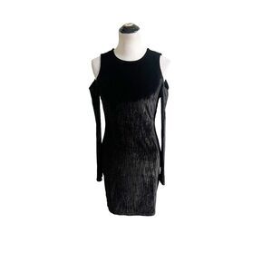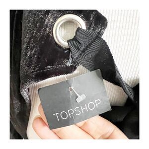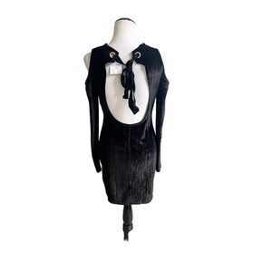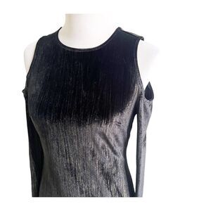 Stand out at your next party or cocktail event with this stunning Topshop metallic dress. The black color with a solid pattern is perfect for any season, while the open shoulder and open back features add a touch of glamour to the overall look. The tie closure and short dress length make it a great choice for a night out. This bodycon mini dress is brand new with tags and is a size 8