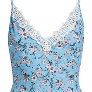 One-piece swimsuit, lace trim and a ditsy floral print, V-neck and an open back.