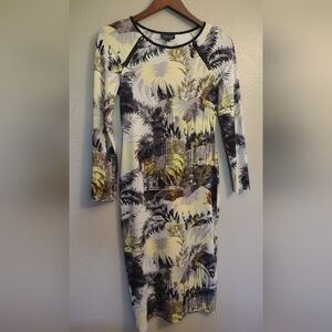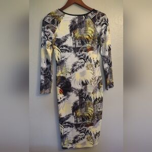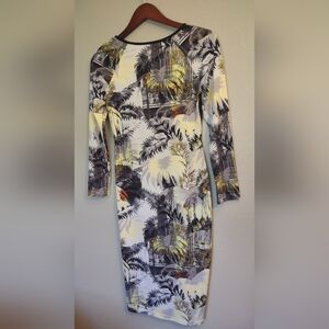 Topshop, bodycon, midi dress, long sleeve, body-con, body con, tight dress, body hugging, bodycon midi, bodycon long sleeve, tropical, palm print, cityscape, urban print, city print, jungle print, graphic print, statement print, yellow, grey, gray, black, white, multi-color, exposed zipper, zipper detail, zipper shoulder, black trim, party, going out, date night, cocktail, night out, holiday dress, edgy, street style