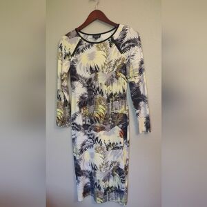 This striking Topshop midi dress features a bold, graphic print that merges tropical palm leaves with a subtle cityscape or urban design in shades of yellow, grey, white, and black.