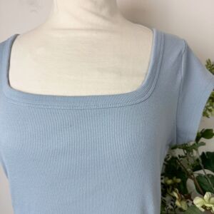 ribbed knit, square neck, periwinkle blue, short sleeve top, cotton blend
