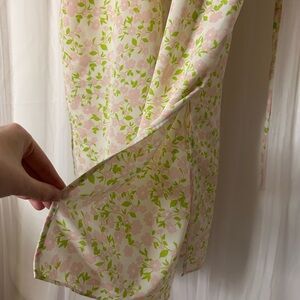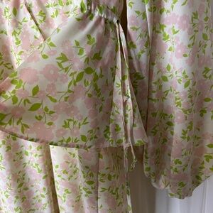 Charming floral dress with pink and green pattern. Features a flattering design for a stylish look. Has adjustable strings on sides for tighter fit and slits on sides. The only flaw is one string is shorter than the others.