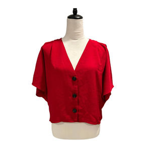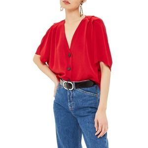Pretty shoulder pleats charm this satiny button-down blouse styled with a flattering V-neck and abbreviated sleeves.