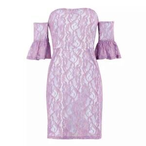 Topshop purple lace mini dress in US size 6 (UK 10 / EU 38). Features a draped cowl neckline, soft ruffle sleeves, and a fitted silhouette.
