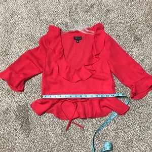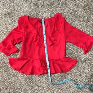 Chic red blouse with ruffle details. Features a flattering wrap design. Perfect for any occasion.