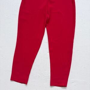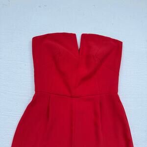 Striking red strapless jumpsuit with a flattering pleated front and structured bodice. Tapered leg and clean zip-up back make this a bold go-to for nights out, parties, or formal events. Tailored with no stretch for a sleek, sculpted fit.