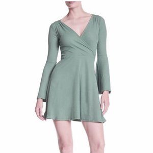 Topshop Ribbed Dress Bell Long Sleeves V-Neck Size 8 Nylon & Elastane Green