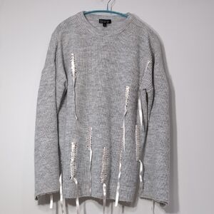 Stylish gray sweater with unique white ribbon details. Crew neck design. Perfect for casual wear.