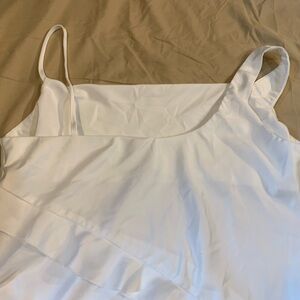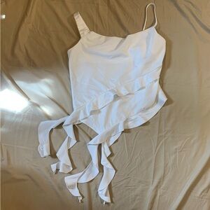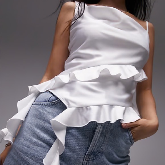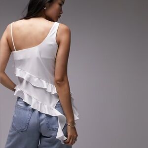This chic Topshop camisole features a sleeveless design with an asymmetrical cut and a stylish ruffle front detail. Crafted in a crisp ivory color, it offers a modern and versatile look perfect for any casual occasion. The lightweight fabric makes it an ideal choice for warm weather.