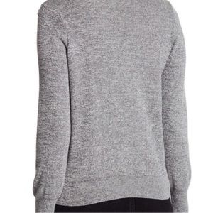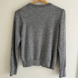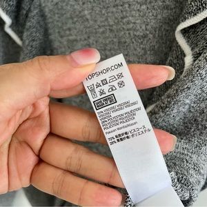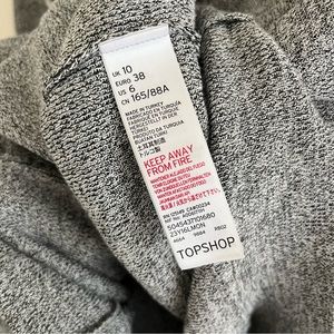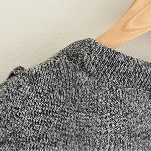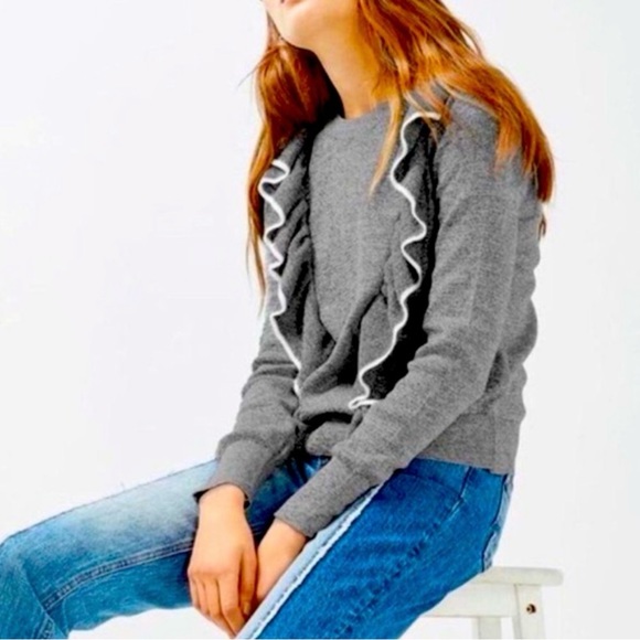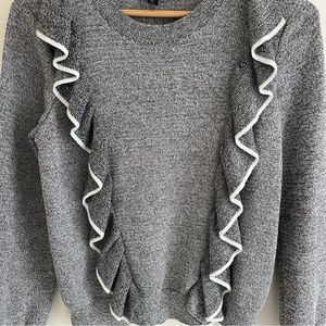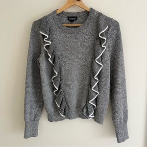 Grey and white knit ruffle front sweater by Topshop. Women’s size 6. In good condition. Some very minor pilling and a small snag on the back collar as shown in last picture.
