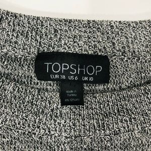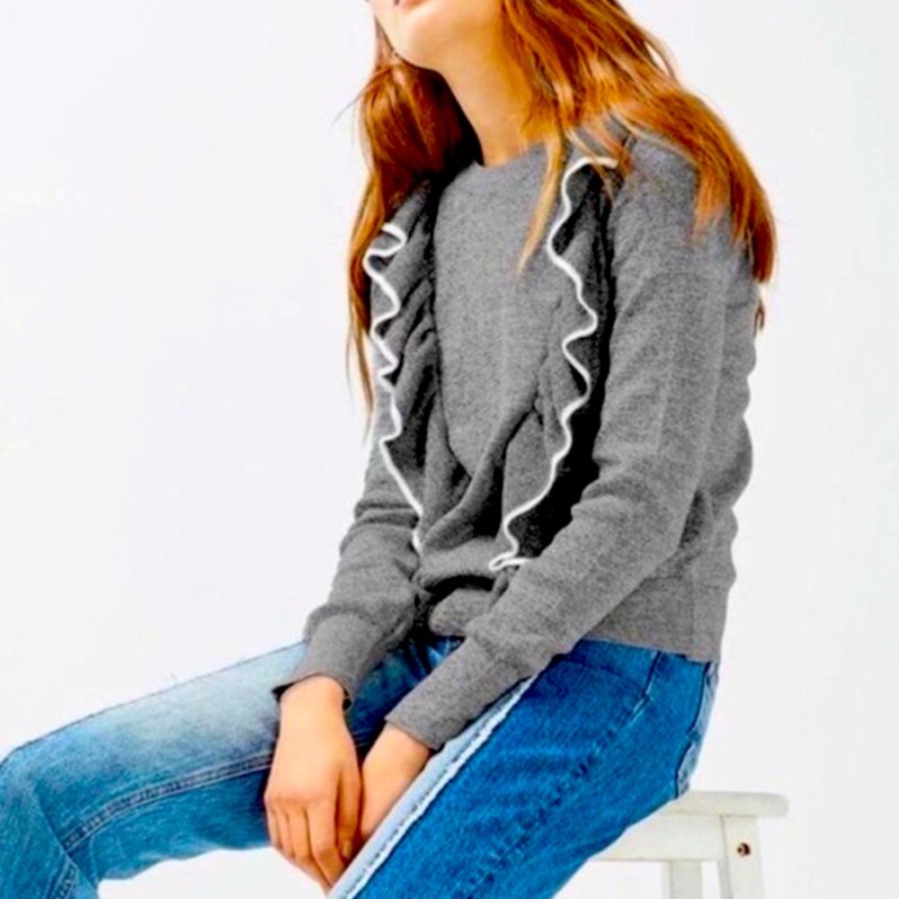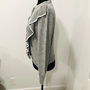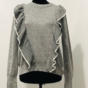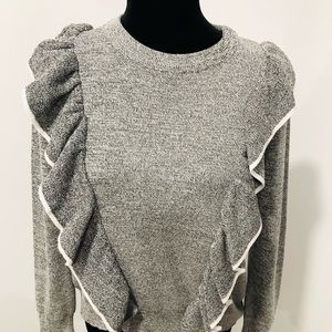 Excellent condition. Topshop crewneck ruffled knit sweater with long sleeves in a heathered gray/black/white. Ruffles on the chest add cute detail to a simple sweater. Approx measurements laying flat: chest 19” pit to pit, length 21”.