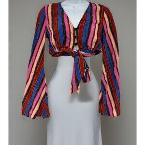 The Topshop Striped Long Sleeve Tie Front Crop Top in Women's Size 2 features a fun and colorful design perfect for the 4th of July. This blouse has a V-neckline, flared sleeves, and a tie closure at the waist for a stylish look. Made of viscose material and featuring accents like embossed details and glitter, this top is suitable for both party/cocktail occasions and casual wear. The multicolor star-themed design adds a playful touch to the cropped style, making it a versatile piece for summer, fall, and spring seasons.
