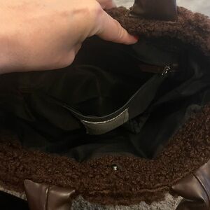 Top Shop chocolate Brown faux shearling faux leather top handle bag. In excellent preloved condition. Only worn a few times. Inside zipper pocket and very clean interior. No callouts that I can find!