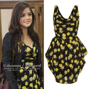 Topshop Tall Black and Yellow Rose Dress as seen on Aria Montgomery in Pretty Little Liars season 1 episode 7. Same style, brand, and color. Topshop can run a little small sometimes. Just ask if you'd like any measurements, though it can take me a few days to get chance.
