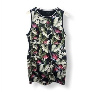 Topshop Tropical Floral Jesery Style Bodycon Sheath Dress. Stretchy Structured Tight Fitted Dress. Sleveless.Ringer Trim Jersey Style Neckline. Tropical Floral Leaf FLower Print. Dark Black, Green, and Red Colors. Thicker Stretchy Jersey Material. No Stains or Rips. CUte & Comfy!