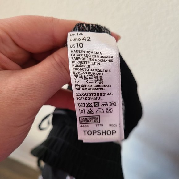 Good used condition Topshop US women's size 10 boho jogger style pants in black/white/orange floral pattern with drawstring and elastic waistband. 100% viscose. No major flaws to note. Approximate measurements have been provided in photos for fit.