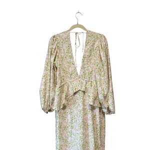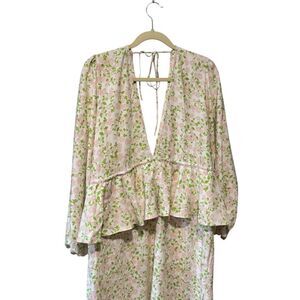 Plunging v neck, long balloon sleeves, elasticated cuffs, drawstring around the waist, peplum frill, all over floral print, slit up the side.