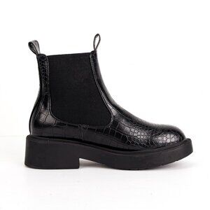 Topshop's Alpha vegan leather boots feature croc-embossed texture & 2" platform. Festival-ready Chelsea style with elastic panels.