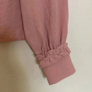 Topshop Womens size 6 Pink Large Collar Long Sleeve Ruffle Blouse Button Down. This blouse is pre-owned. Small mark on the collar. May be able to clean it but unsure. Measurements: 18.5 inch chest 18.5 inch waist 20 inch length 24 inch arm length
