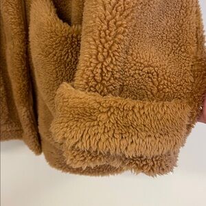 Cozy and chic Topshop oversized teddy coat in a warm tan color. Designed with a full zip closure plus snaps, roomy front pockets, and a plush teddy-bear texture. Perfect for layering on chilly days while keeping your look modern and stylish.