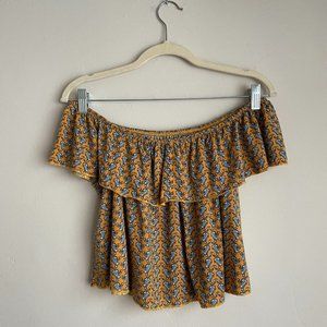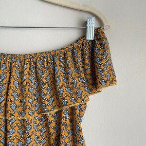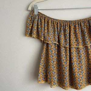 Yellow & blue paisley print, off the shoulder style, stretchy fabric, elastic across the shoulders.