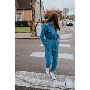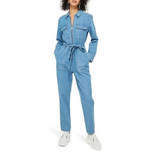 Topshop Zip-Up Belted Utility Denim Boiler Suit in Blue. Size 8. Features collar, long sleeves with button cuffs, front zipper closure, belt loops, belted, chest flap pockets, side pockets, and tapered leg. 100% Cotton. Excellent pre-owned condition, no flaws.