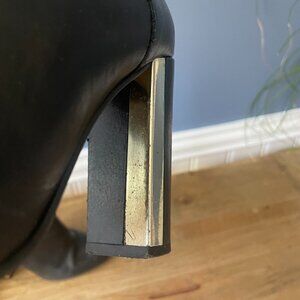 These chic black leather ankle boots feature a sleek pointed toe and a standout metallic block heel, adding a touch of edgy sophistication to any outfit. With a side zipper for easy wear, these boots are perfect for elevating both casual and dressy looks.