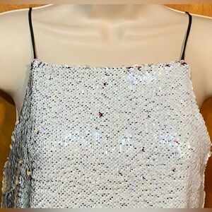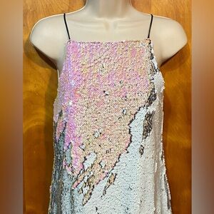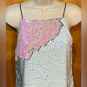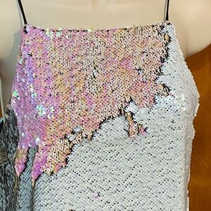 Adorable dress in like new condition from Top Shop is so cool! Similar to the “Mermaid “ sequin throw pillows where the sequins flip over to make different words and patterns or change from one color to another. This dress is covered front and back with the same type of sequins. White on one side and iridescent pink on the other. You can wear it so many ways, changing colors and patterns throughout the night! lol. Be the life of the party in this unique fun dress. Just swipe your hand and get a whole new look! The dress itself is A-line cut, mini length with black spaghetti straps and full attached black fabric lining. High straight neckline with V back. Size 4. See color transformation in photos. So much better in person but I did my best!