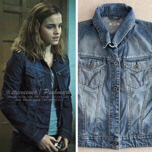 Topshop moto Denim Jacket as seen on Hermione Granger (Emma Watson) in Harry Potter and the Deathly Hallows Part 1 (2010). Same style and brand, alternate color. This one's in a lighter wash. The 'creasing' pattern seen at the elbows and hem is part of the intentional distressed look. A UK10 is a US6, though Topshop can occasionally run smaller. Laid flat, pit to pit is 17"