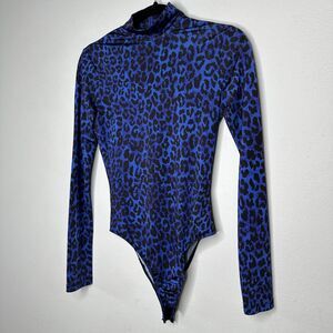 Topshop x Halpern Blue & Black Cheetah Mock Neck Long Sleeve Back Zip Snap Bottom Bodysuit