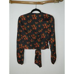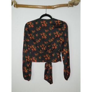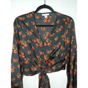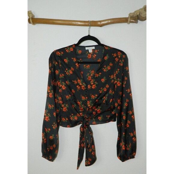 Topshop Blouse Black Red Floral Print Corset Tie Cropped Long Sleeve Size 2